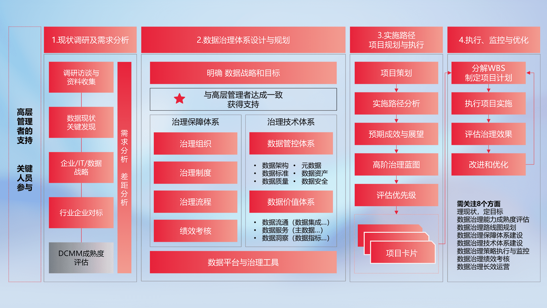 制定并执行统一的数据标准,,,规范数据定义和格式,,,消除冗余和不一致性,,,,实现跨部门和跨系统的数据一致性,,,,为企业提供标准化的数据基础。。